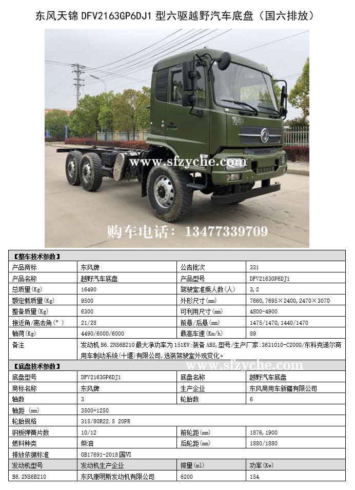 東風(fēng)天錦DFV2163GP6DJ1型六驅(qū)越野汽車底盤參數(shù),國六排放六驅(qū)天錦系列公告在第331批《道路機(jī)動(dòng)車輛生產(chǎn)企業(yè)及產(chǎn)品公告》新產(chǎn)品公示中已公示,公示完成即可正常上戶。