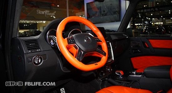 北京車展上的基于G63 AMG 6×6改裝而來的BRABUS 版700G 6 X 6 內飾方面,該車采用了黑色和橘黃色的顏色搭配,強烈的顏色反差構造出不錯的視覺效果。四幅式真皮方向盤外圈也采用橘黃色真皮包裹,搭配顏色裝飾條,視覺效果極佳。擋把的設計類似于飛機操作感,上面印有巴博斯的標志,非常具有設計感。