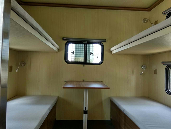 3、休息區(qū)備有4個(gè)上下鋪8個(gè)床位,配有床墊,每個(gè)上下床鋪依靠的墻壁上都有一個(gè)風(fēng)景透氣窗。每個(gè)床鋪下面設(shè)一組附件柜,床位兩側(cè)上方各配衣帽鉤、插座和可調(diào)節(jié)床頭燈,休息區(qū)配有19寸液晶電視一臺(tái)及空調(diào)一部。